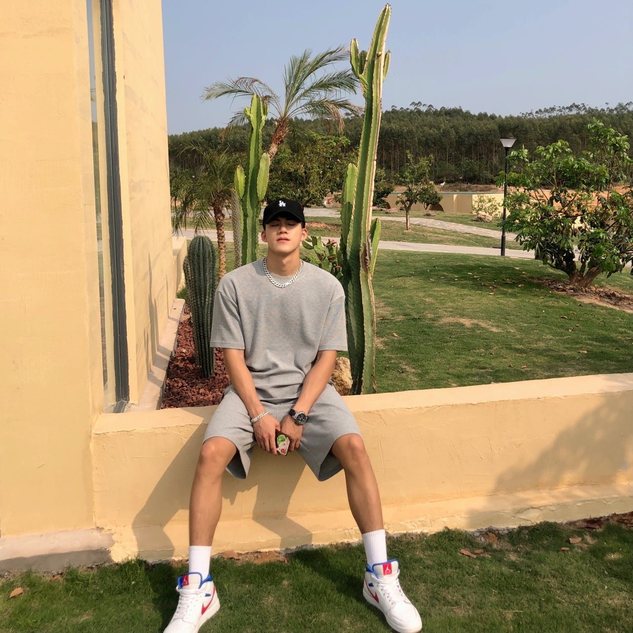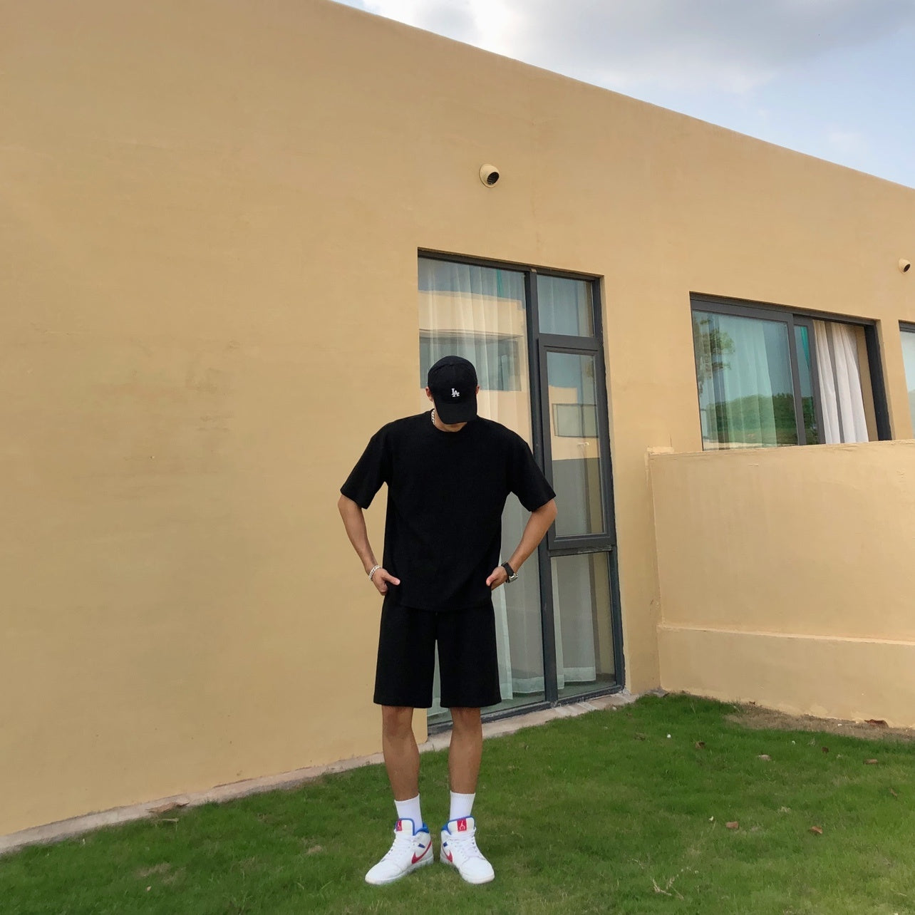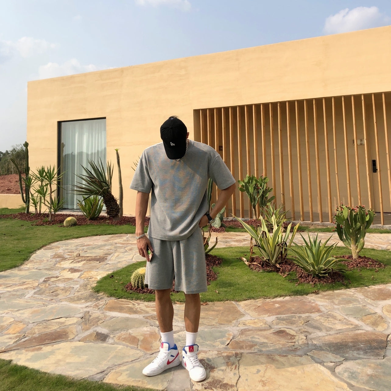 Bare Arms Summer New Loose Cotton Sports Casual Suit Waffle Short Sleeve T-shirt Quarter Shorts For Men