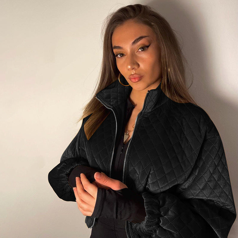 Diamond Plaid Stand Collar Zipper Short Jacket Temperament