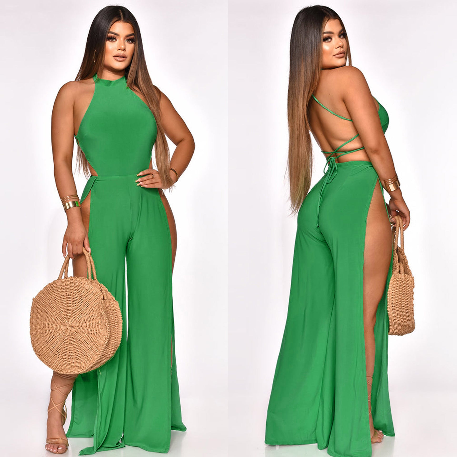 Lace-up Back Jumpsuit Split Leg Casual Trousers Women