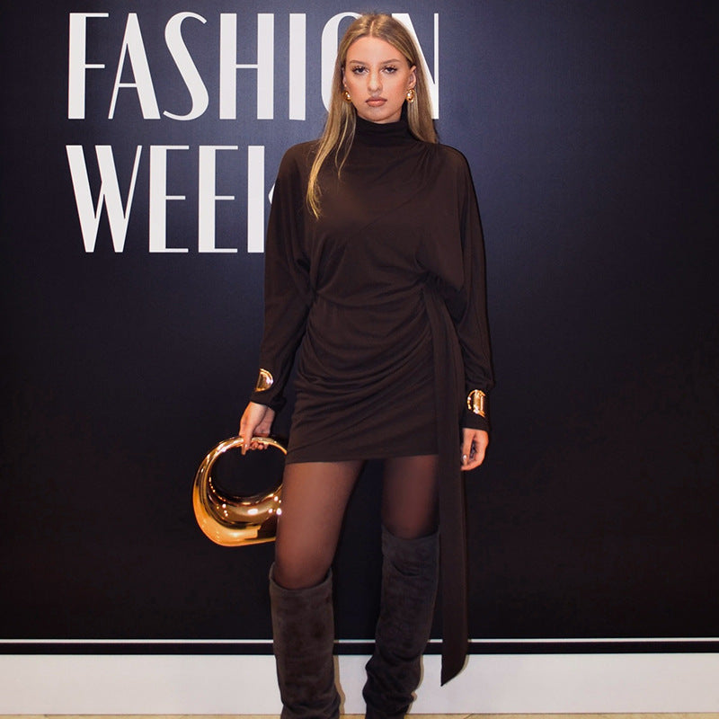 New Pure Color Half Collar Waist-tight Sheath Sexy Dress Women