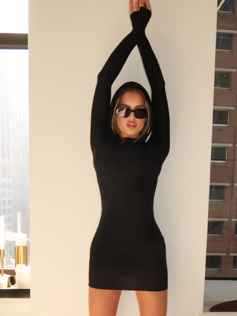 Short Skirt Women's Solid Color Long Sleeve Hooded Dress