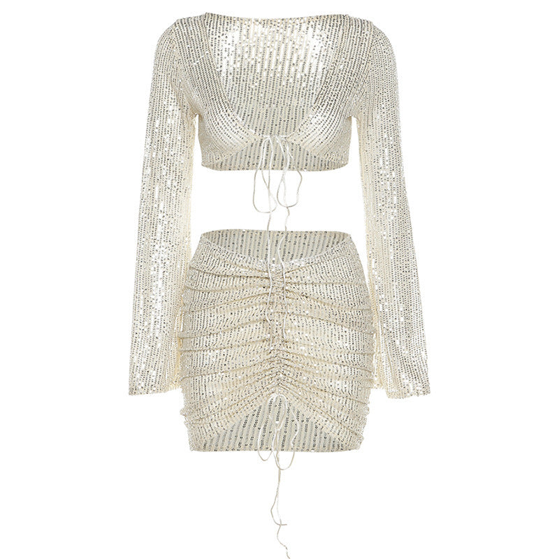 Summer New Atyle Aequin Atrap Cardigan High Waist Bag Hip Skirt Casual Suit