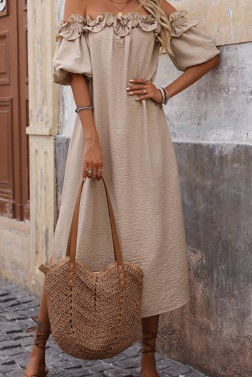 Women's Fashionable Off Shoulder Ruffle Trim Slit Dress