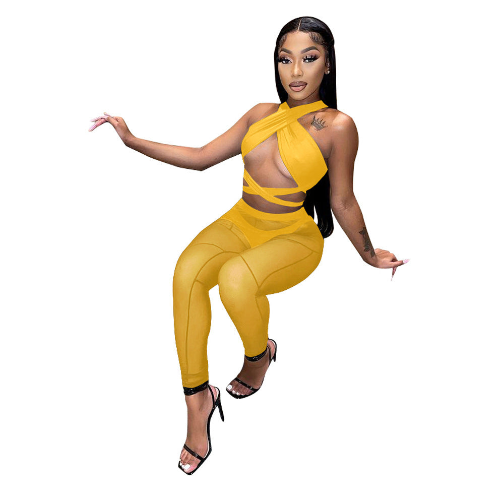 Women's Hollow Halter Cross Mesh Panel Three Piece Set