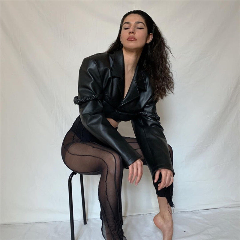 Women's New Style Long-sleeved Lapel Umbilical Slimming PU Leather Top